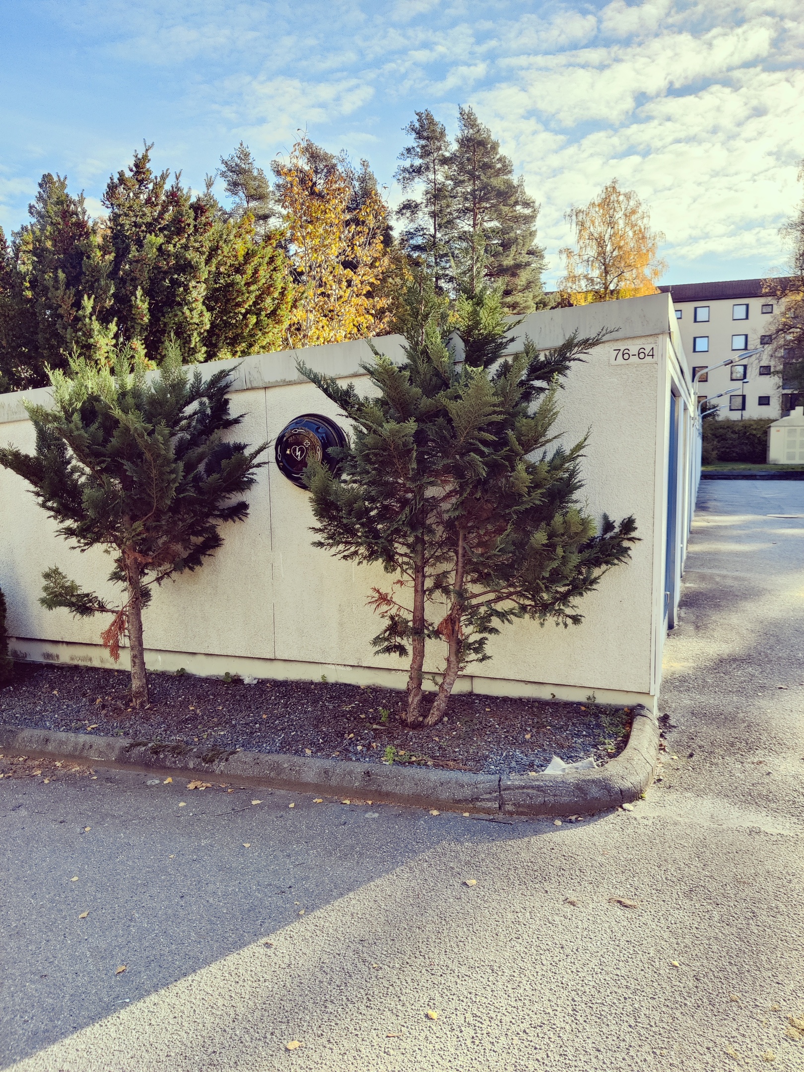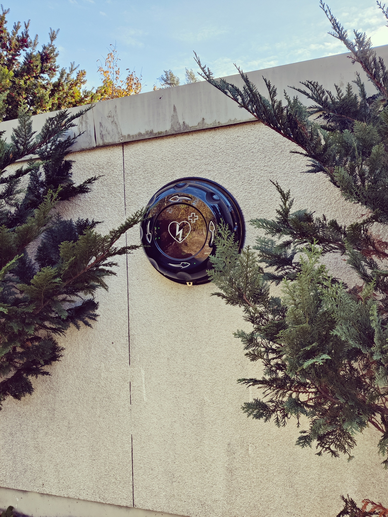 Hjärtstartaren hänger på sidan av vårt gemensamma garage.